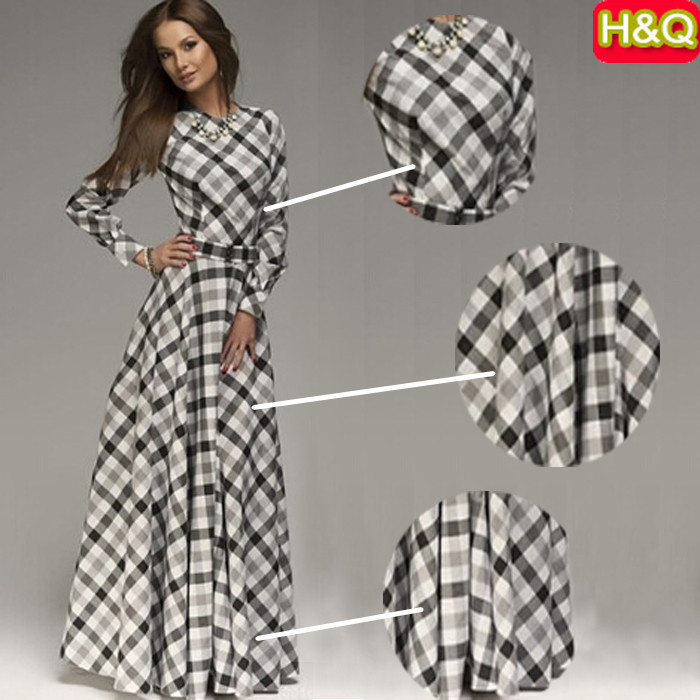 H&Q 2015 Women Plaid Shirt Dress Casual Long Sleeve Elegant Ladies Grid Floor Length Dresses 01-276