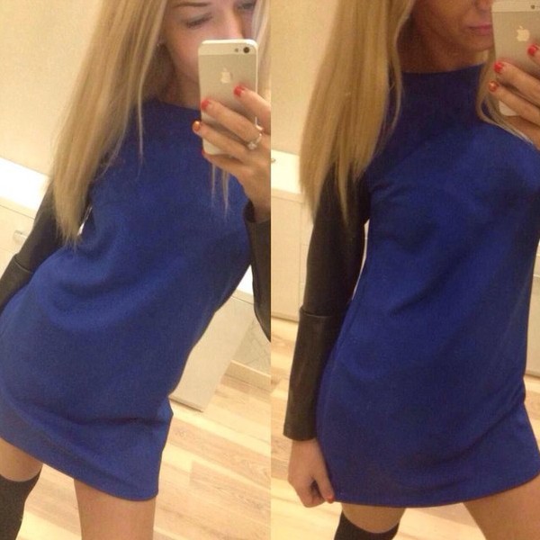 New 2015 Spring&Autumn Casual Women Pu Leather Patchwork Long Sleeve Straight Bottoming Super Mini Dress, 2 Colors, S, M, L, XL