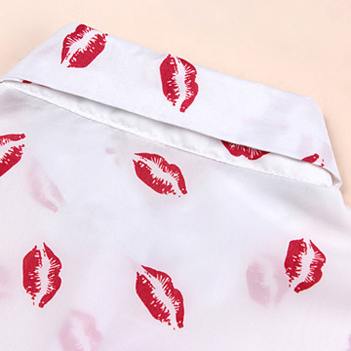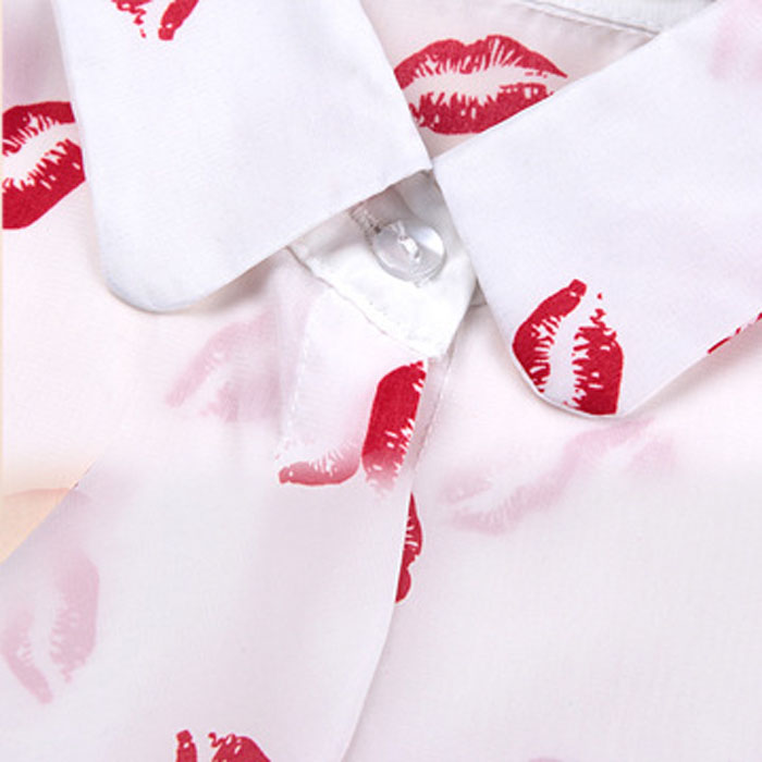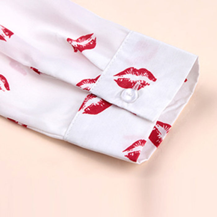 Women Lips Painted Lapel Long Sleeve Chiffon Shirt Tops Blouse T-shirt