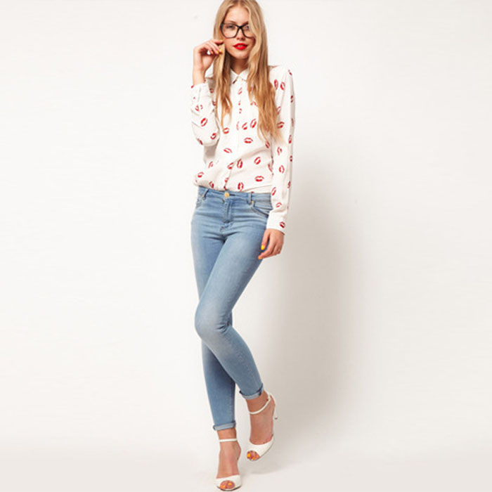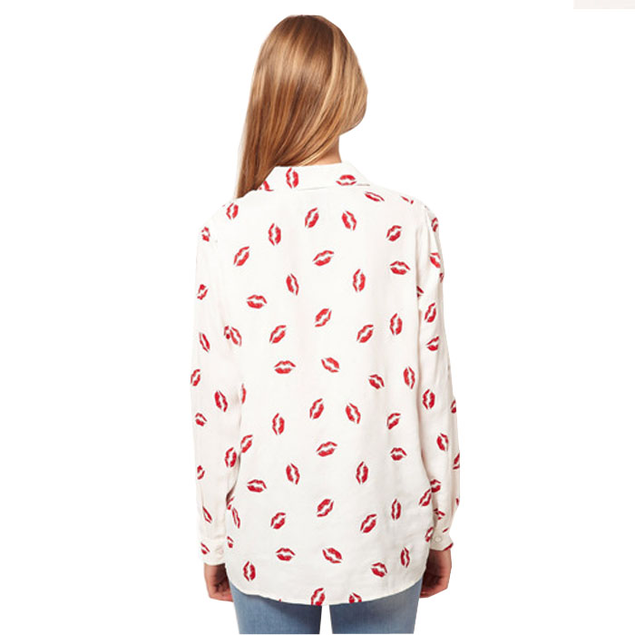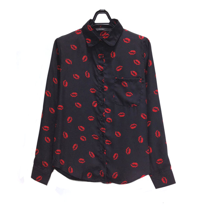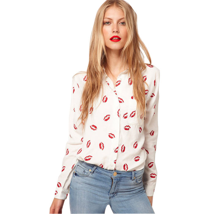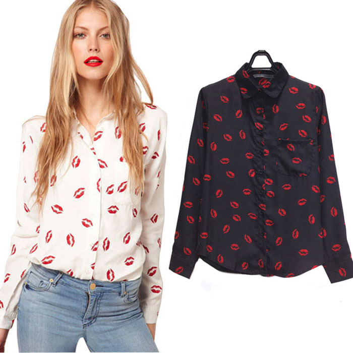 New Fashion Women Lips Painted Lapel Long Sleeve Chiffon Shirt Tops Blouse T-shirt Lucky