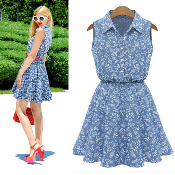 New Summer Fashion Women Lady Lapel Sleeveless Casual Slim Denim Dress Tonsee