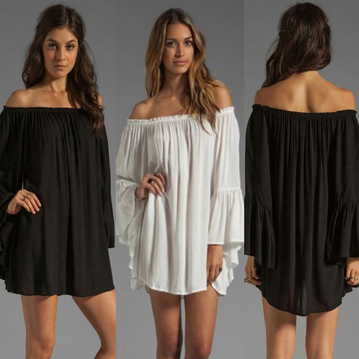Plus size 2015 Fashion Women Dress Boho Solid Ruffle Sleeve Off Shoulder Mini Dress Beach Dress Women Free Shipping Tonsee