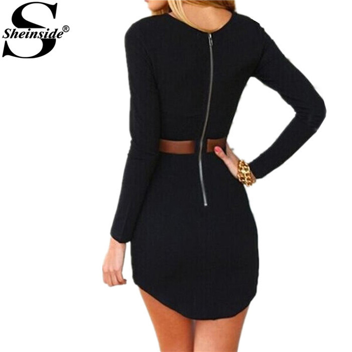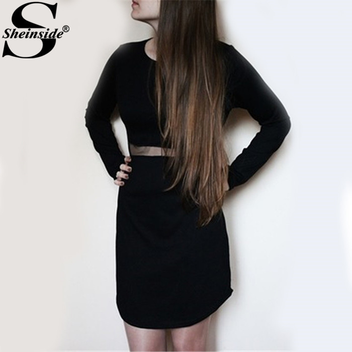 Sheinside 2015 Designs Newest Spring Women Clothing Fashion Black Long Sleeve Contrast Sheer Mesh Hollow Slim Bodycon Dress