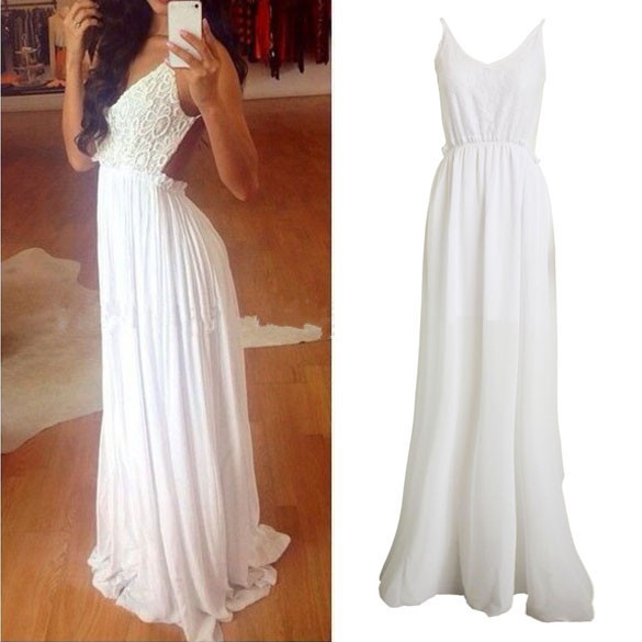 Women Sexy Lace stitching Long Chiffon Backless Strap Evening Floor Maxi Dress White FATE